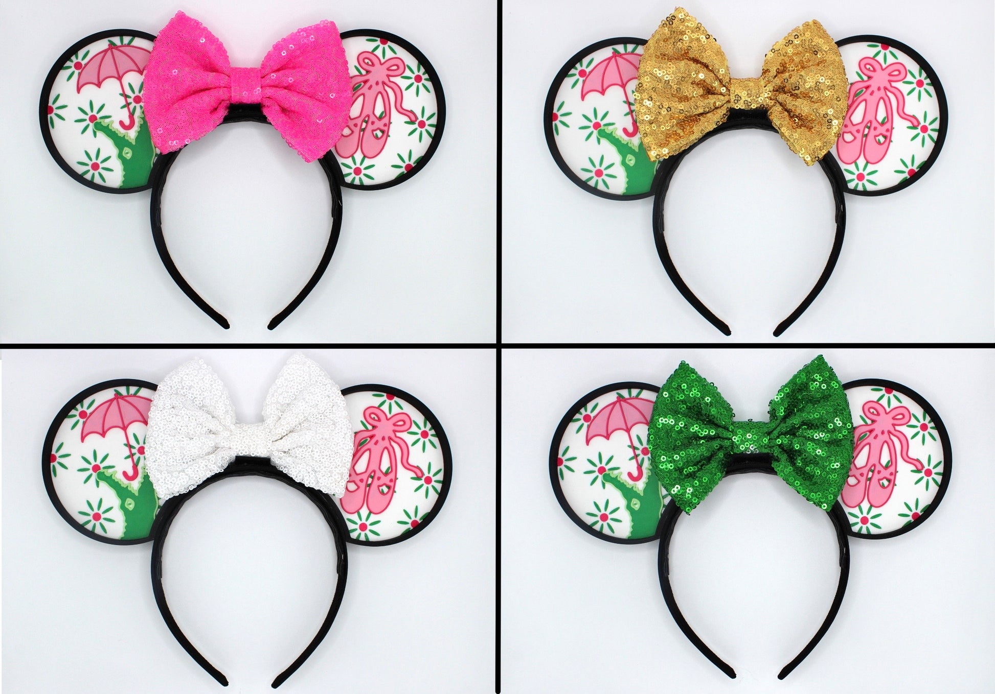 Our Tightrope Walker mouse ears are the perfect accessory for your next trip to the Disney parks or to add to your collection! With the option of 12 different bow colors, you're sure to find the perfect match for your style. The spooky crocodile, ballet shoes, and parasol are a fun nod to the iconic attraction.